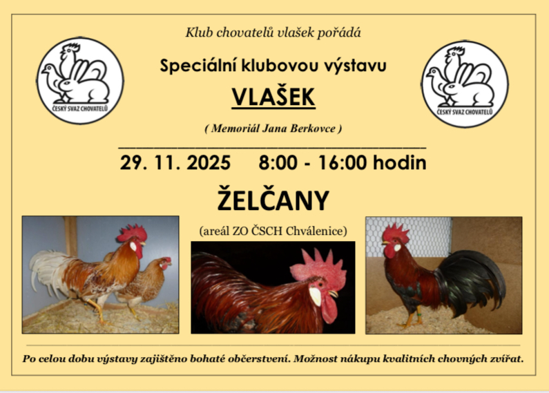 Klub chovatelů vlašek pořádá 29. listopadu 2025 speciální klubovou výstavu. Výstava se bude konat v areálu ČSCH na návsi v Želčanech. Želčany leží na silnici I/20 (E 49) Plzeň - České Budějovice asi 15 km od Plzně. Výstava bude pro veřejnost otevřena do 8:00 do 14:00 hodin. Pro návštěvníky bude připraveno bohaté občerstvení v příjemně vytopené hospůdce.